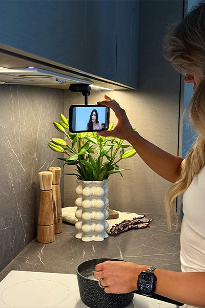 Fäst din iPhone direkt på MagSafe-huvudet.Har du ingen MagSafe?Använd den medföljande metallringen för ett stadigt grepp.